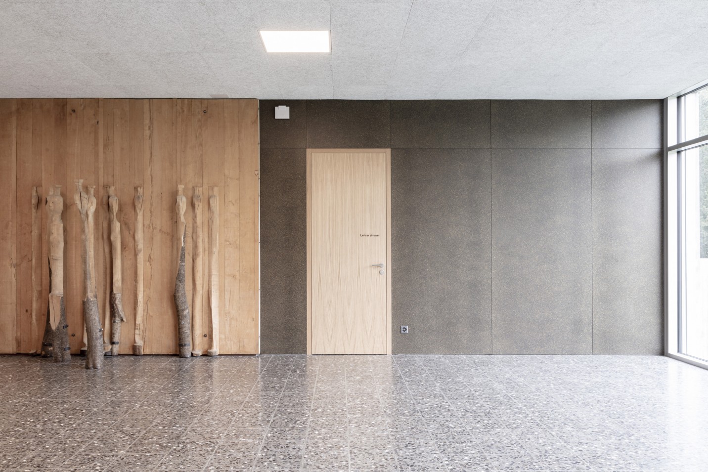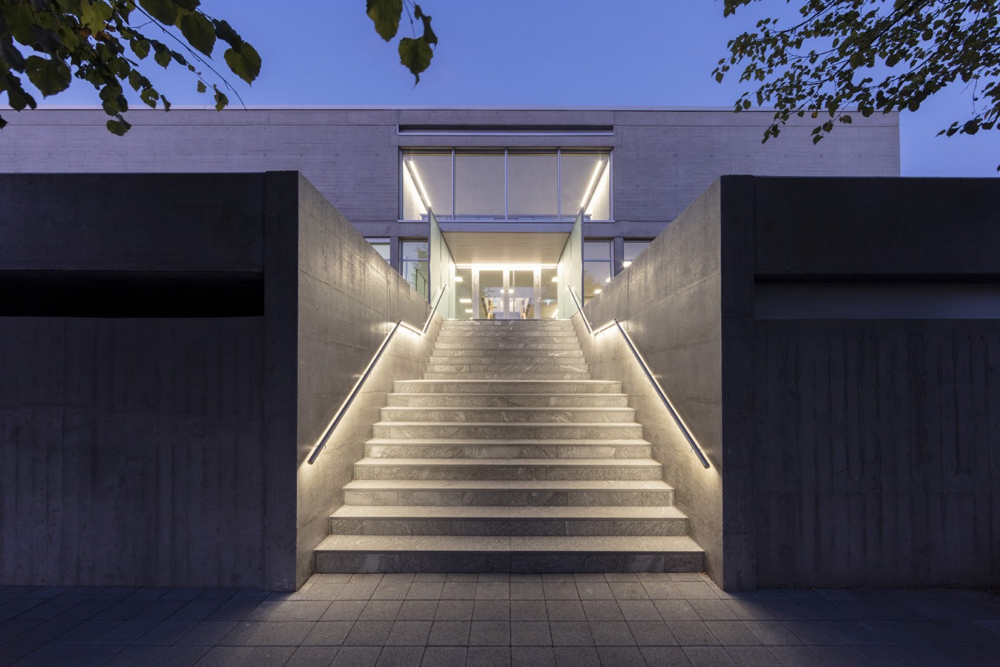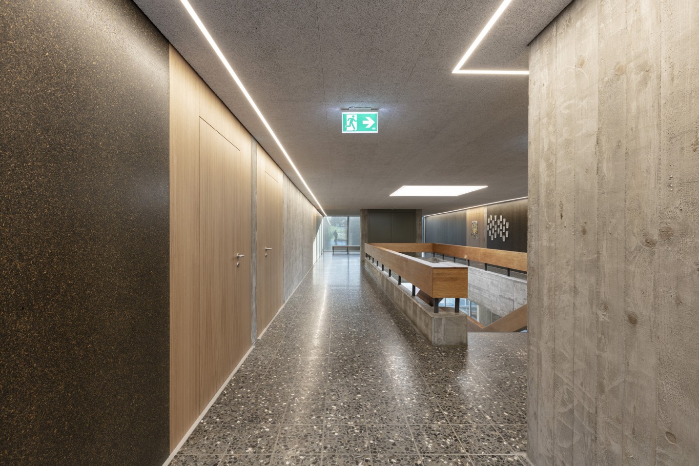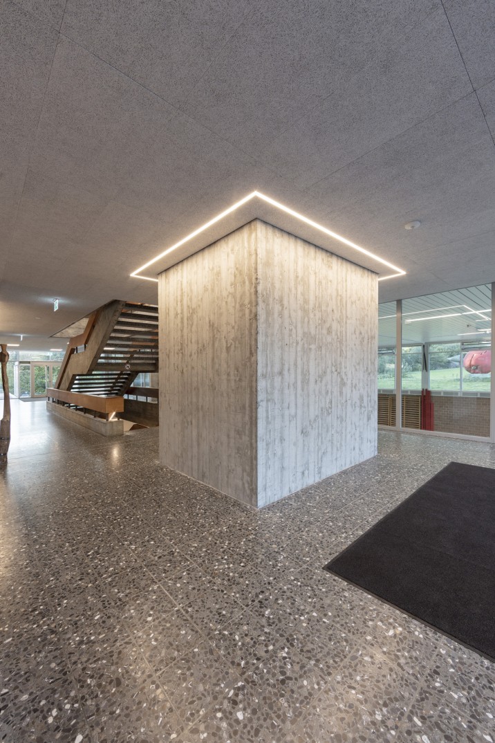Dem Betrachter fällt erst bei genauerer Betrachtung klar welche Elemente alt und welche neu sind. Durch eine aufwendige Betonsanierung konnte die best. Sichtbetonobtik beibehalten werden. Bei der Farb- und Materialwahl wurde bewusst auf die best. und vorherrschenden Materialien (Beton, Glas, Aluminium, Terrazzoboden, Holz) Rücksicht genommen und die neu eingeführten Materialien und Formen dementsprechend ausgewühlt und angepasst. Das Haustechnikkonzept konnte geschickt, nicht sichtbar in der heruntergehängten und demontierbaren Decke geführt werden.