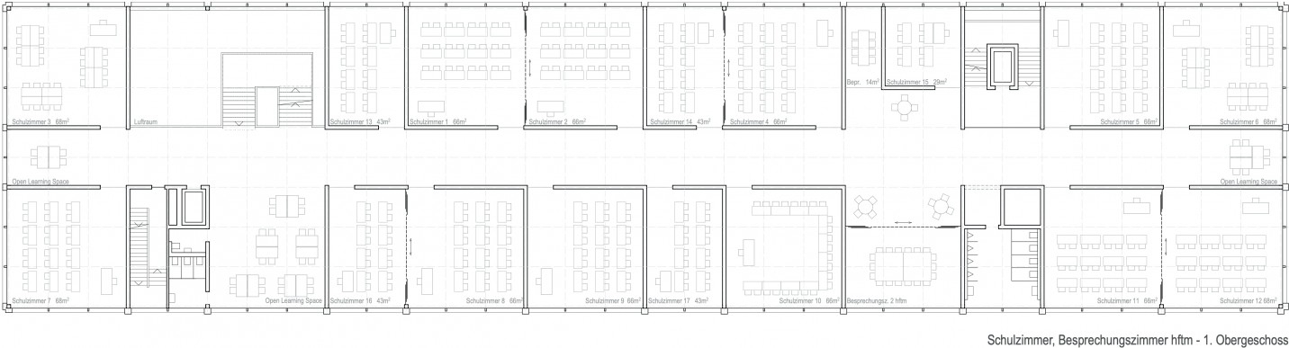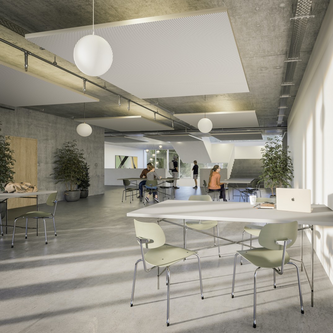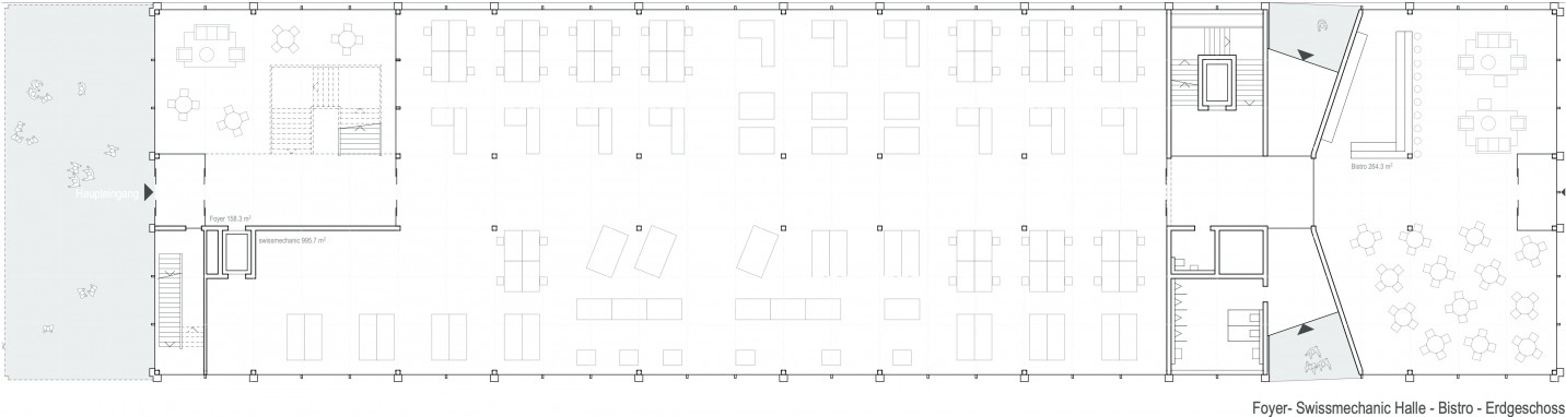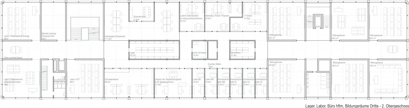 Das Schulgebäude A wird über eine grosszügige repräsentative Treppe bei Haupteingang sowie zwei weiteren Treppenhäuser erschlossen. Diese werden in jedem Geschoss durch eine zentrale Begegnungszone, miteinander verbunden. Dadurch wird eine optimale Verbindung zwischen allen Räumen geschaffen. Im Erdgeschoss befindet sich neben dem Haupteingang mit Foyer und Treppe, dem Bistro und Sanitärräume die grosse Halle für die Swissmechanic. Für die maximale Flexibilität der Organisation der Maschinen, Arbeittsstationen und Werktischen ist die Halle als Open Space Fläche konzipiert.