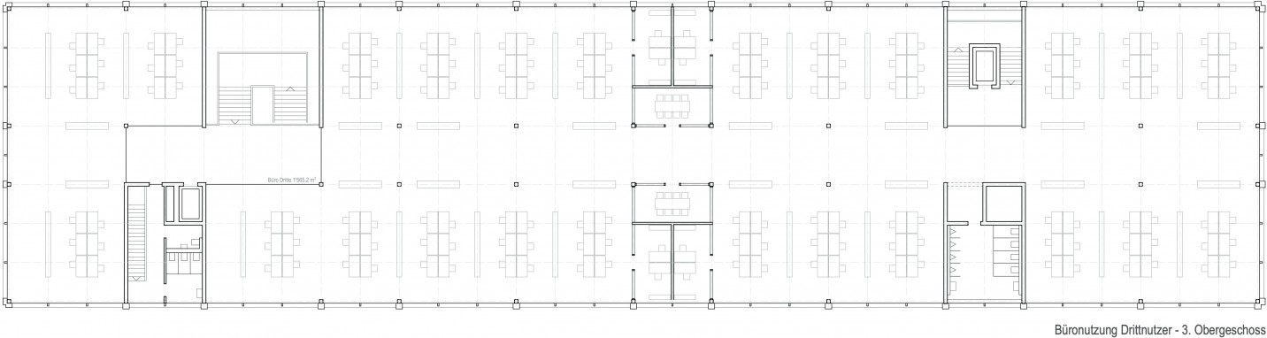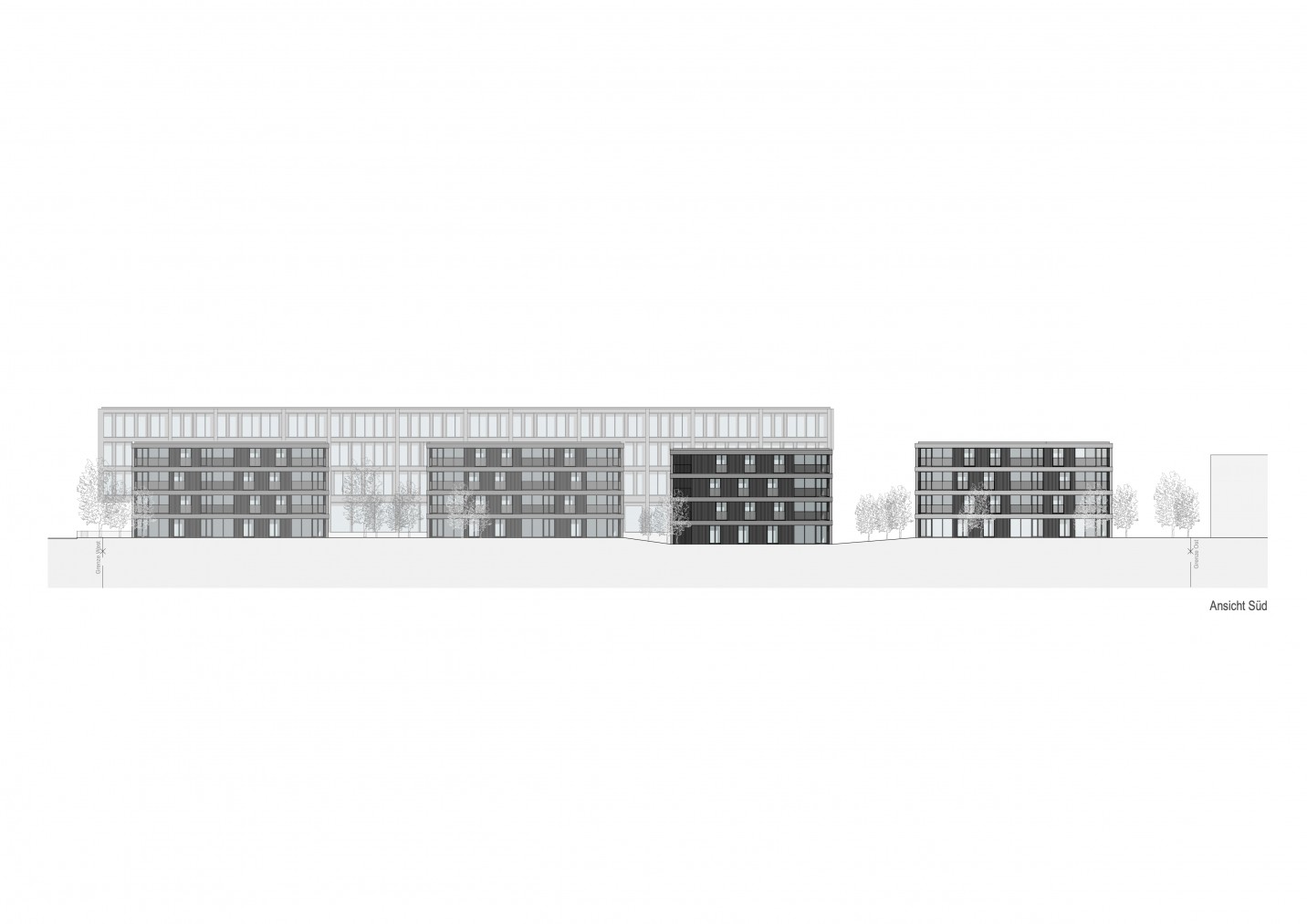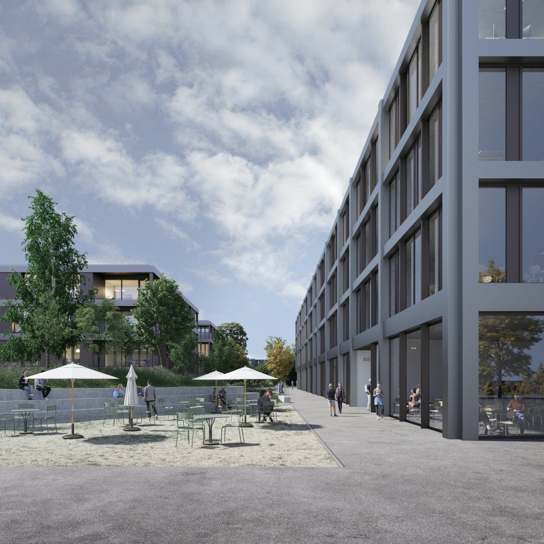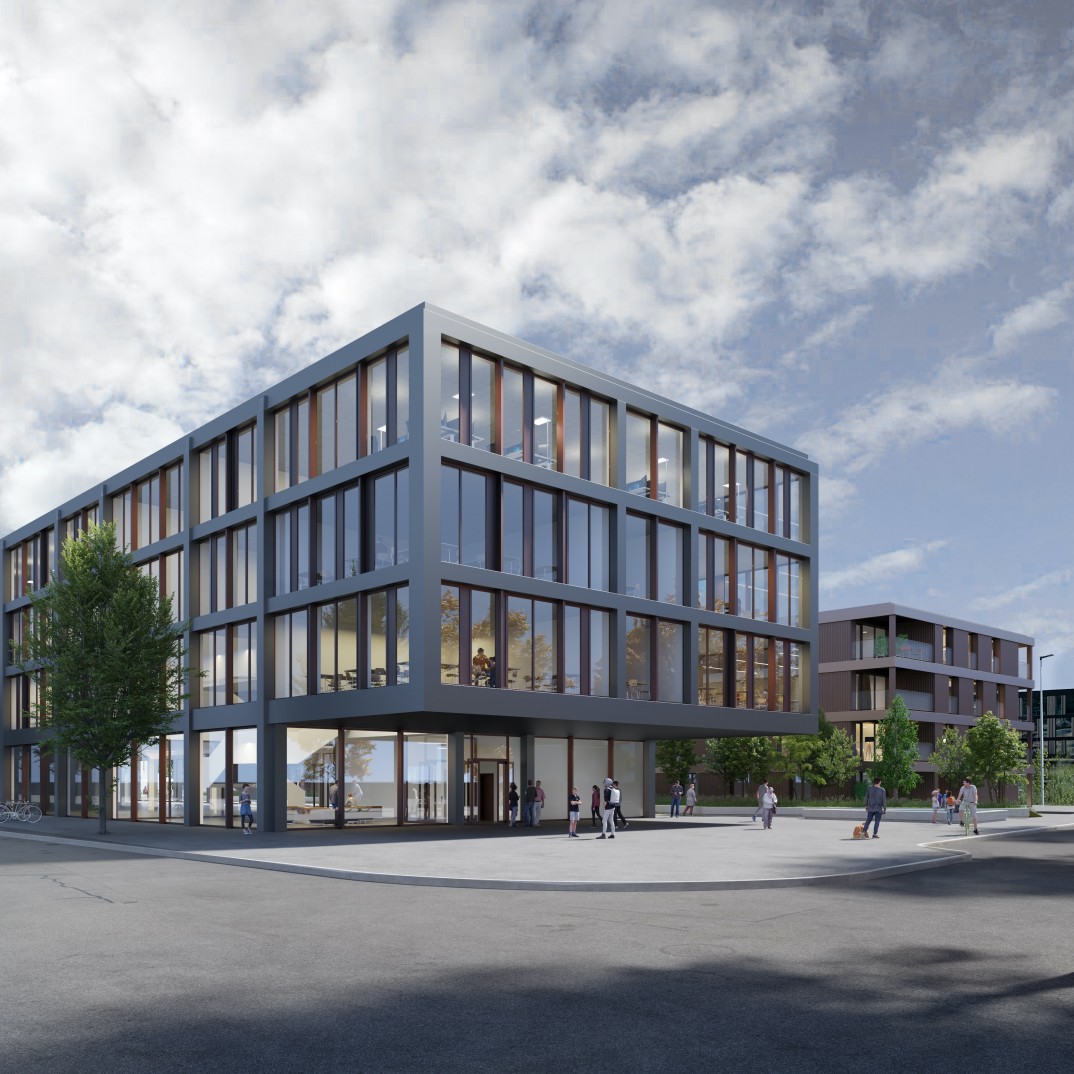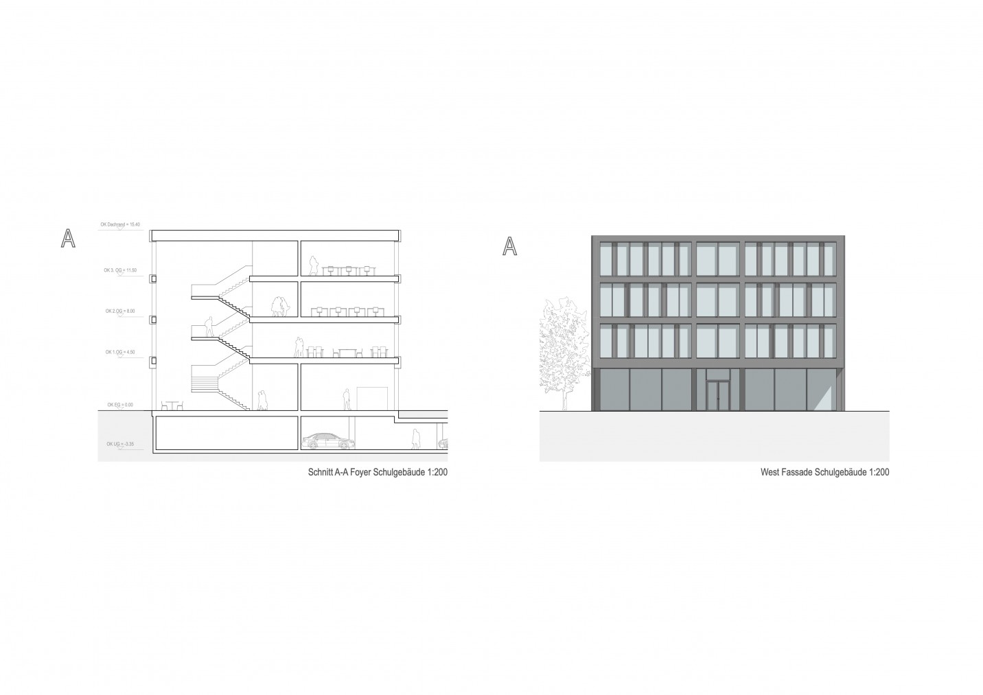Dort ist eine Mischnutzung aus Dienstleistung und Wohnen vorgesehen. Mit unserer Freiraumgestaltung schlagen wir verschiedene Plätze mit unterschiedlichen Aufentahltsqualitäten für die unterschiedlichen Nutzer des Campus Brühlpark vor. Das Schulgebäude A soll einen überregionale Anziehungskraft ausstrahlen. Die Adressbildung des Schulgebäude A mit dem Haupteingang, erfolgt über einen auskragenden und autofreien Gebäudeteil an der nordwestlichen Ecke, an der Riedernstrasse und Brühlstrasse. Dieser gedeckte Platz ermöglicht den Studierenden ein sicheres Ankommen und hat eine starke Anziehungskraft als Treffpunkt. Das architektonische Konzept des Gebäudeausdrucks basiert auf einer tektonischen Auseinandersetzung der Fassadengestaltung. Die starke Horizontalität des Gebäudevolumens wird durch die vertikalen Gliederung der Stützenverkleidungen in der Fassade, gebrochen. Durch das geschossweise versetzten der Öffnungsflügel wird das Fassadenbild weiter aufgelockert.