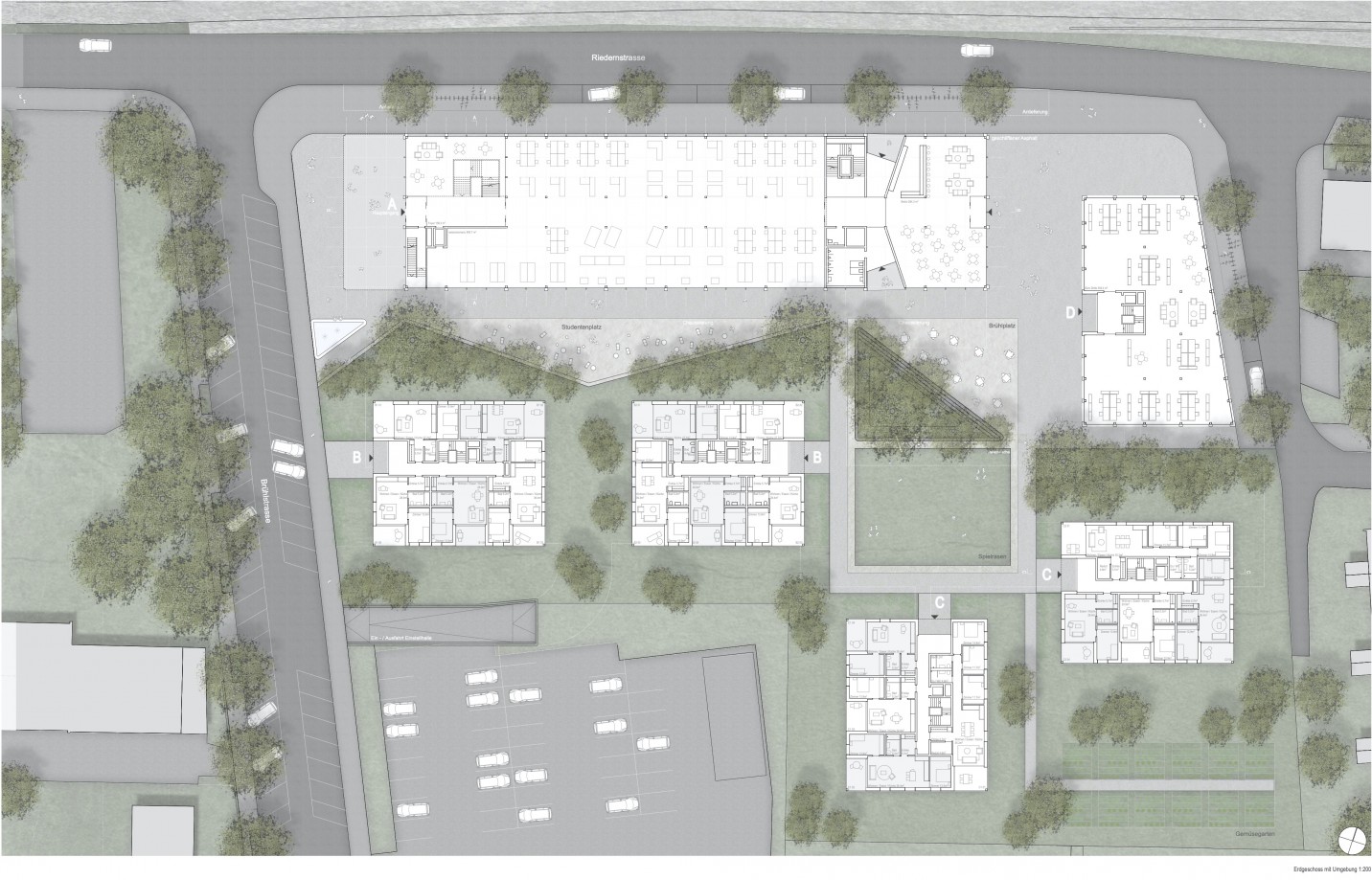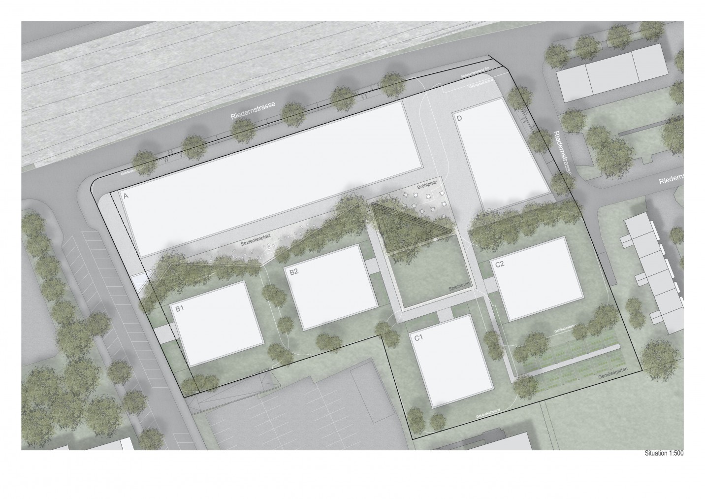 Unser Projektvorschlag sieht eine ortsbauliche Einpassung mit klar gefassten und kompakten Gebäudekörpern vor. Nebst dem Längsbau des Schulungsgebäudes A, schlagen wir fünf weitere Solitärbauten vor. Die Geschossfläche des viergeschossige Schulgebäude A wurde so optimiert, dass die Grundrissorganisation optimal für die Nutzer abgestummen ist. Das Schulgebäude A weisst eine Gebäudehöhe von 15.40 m auf. Die weiteren Gebäude wurden alle mit vier Vollgeschossen geplant. Die Geschossflächen wurden der Wohnnutzung entsprechend optimiert. Durch die Setzung der vier Wohnbauten B1 und B2, sowie C1 und C2 in einer parkähnlichen Umgebung, werden diese durch einen Grüngürtel von Schulbetrieb abgetrennt. Trotz der räumlichen Nähe zum Schulgebäude A entstehen so attraktive Wohnungen. Der fünfte Solitärbau D bildet den nordöstlichen Abschluss des Campus Brühlpark.
